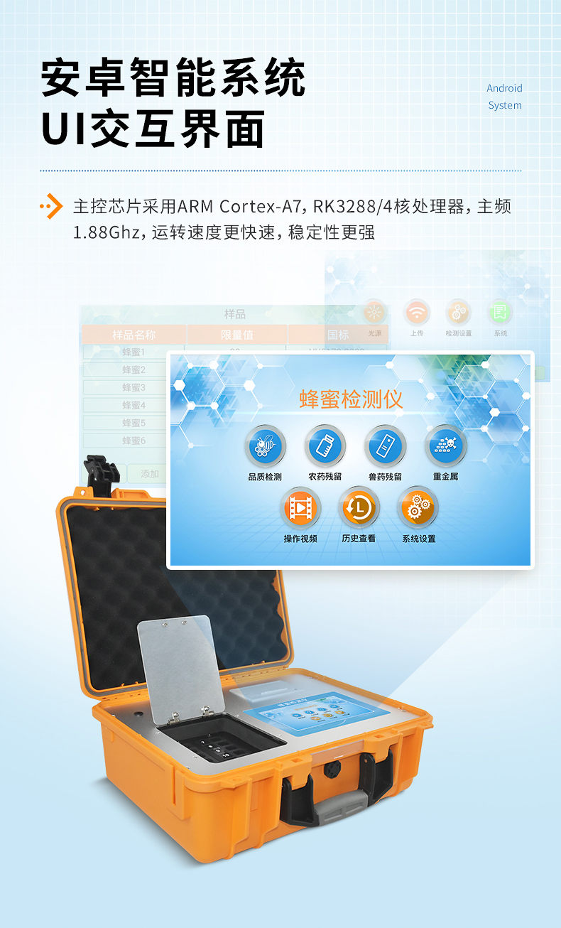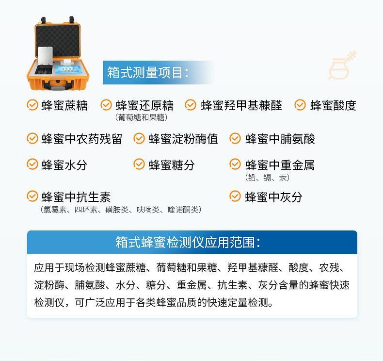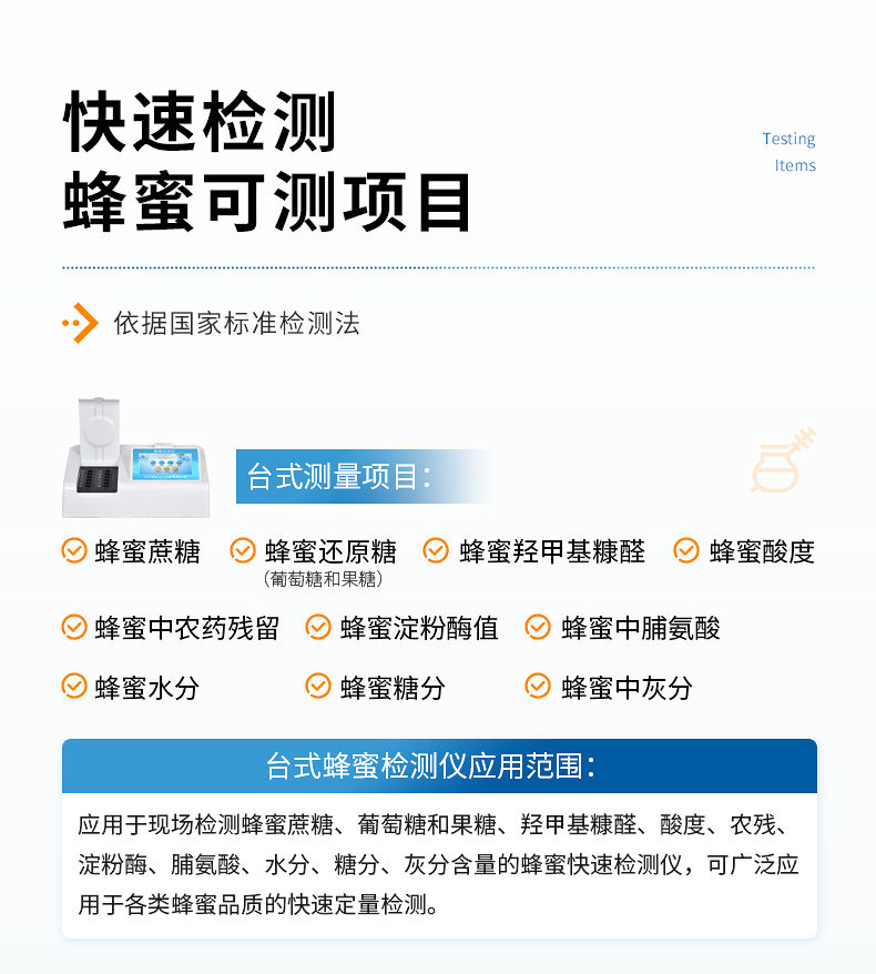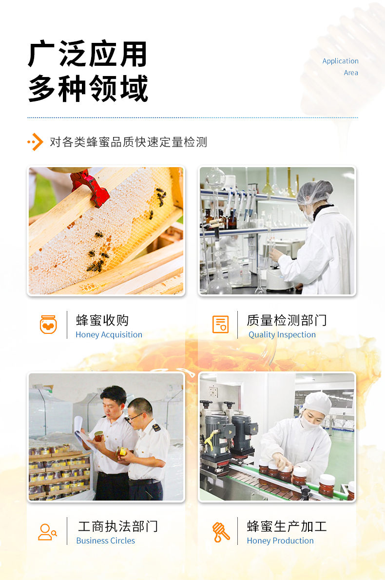 檢測項目:蜂蜜蔗糖、蜂蜜還原糖(葡萄糖和果糖)、蜂蜜羥甲基糠醛、蜂蜜酸度、蜂蜜中農(nóng)藥殘留、蜂蜜淀粉酶值、蜂蜜中脯氨酸、蜂蜜水分、蜂蜜糖分、蜂蜜中重金屬(鉛、鎘、汞)、蜂蜜中獸藥殘留(氯霉素、四環(huán)素、磺胺類、呋喃類、喹諾酮類)、蜂蜜中灰分,應(yīng)用范圍:應(yīng)用于現(xiàn)場檢測蜂蜜蔗糖、葡萄糖和果糖、羥甲基糠醛、酸度、農(nóng)殘、淀粉酶、脯氨酸、水分、糖分、重金屬、獸殘、灰分含量的蜂蜜快速檢測儀,可廣泛應(yīng)用于各類蜂蜜品質(zhì)的快速定量檢測。