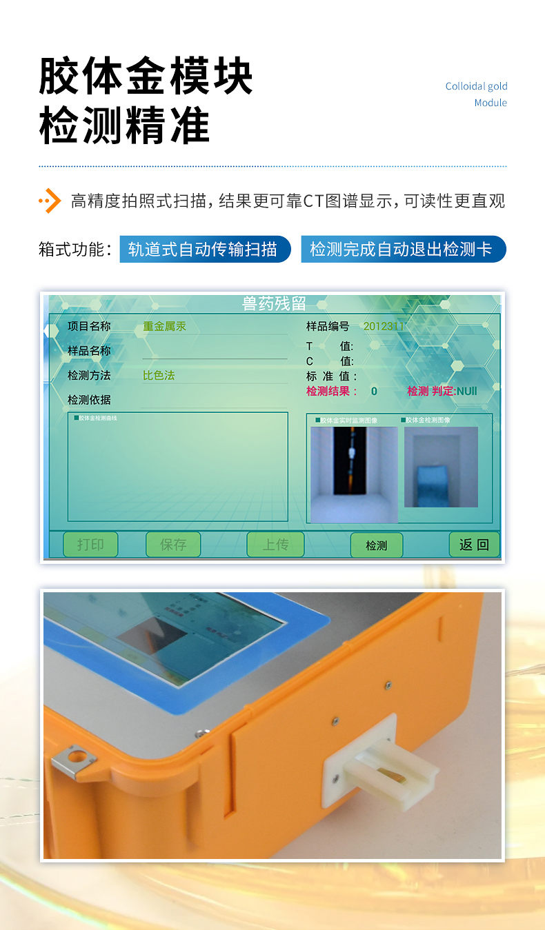 7、膠體金模塊檢測方式:軌道式自動傳輸掃描,檢測完成后自動退出檢測卡。