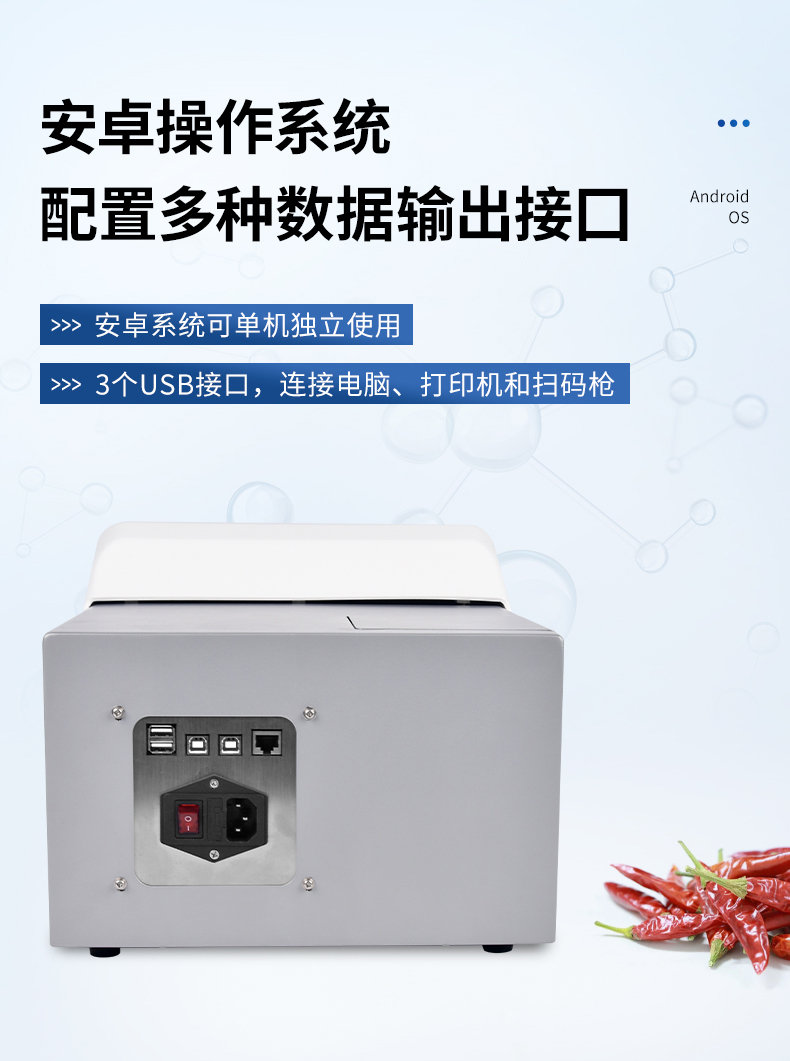 辣椒素檢測(cè)儀主要用于各種辣椒及辣椒制品中的天然辣椒素、辣度檢測(cè)。儀器由亮度發(fā)光二管光源、比色池、高靈敏度集成光電池、微處理器、漢字大屏幕液晶屏、嵌入式微型熱敏打印機(jī)集成芯片構(gòu)成,可直接在大屏幕液晶屏上顯示出被測(cè)樣品中相關(guān)指標(biāo)的含量,并打印出分析結(jié)果,還可以通過(guò)計(jì)算機(jī)接口將數(shù)據(jù)傳輸?shù)诫娔X進(jìn)行數(shù)據(jù)分析。
