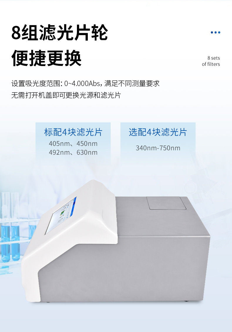 設(shè)置吸光度范圍:0~4.000Abs,滿足不同測(cè)量要求,并配備了8組濾光片輪,標(biāo)配4組濾光片,根據(jù)使用 可選配340 nm~750nm波長(zhǎng)的濾光片組合使用。設(shè)計(jì)合理無(wú)需打開(kāi)機(jī)蓋就可更換光源和濾光片;