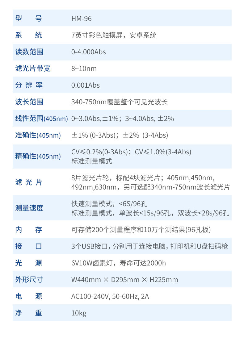 內(nèi)存:可存儲(chǔ)200個(gè)測(cè)量程序和10萬(wàn)個(gè)測(cè)結(jié)果(96孔板)