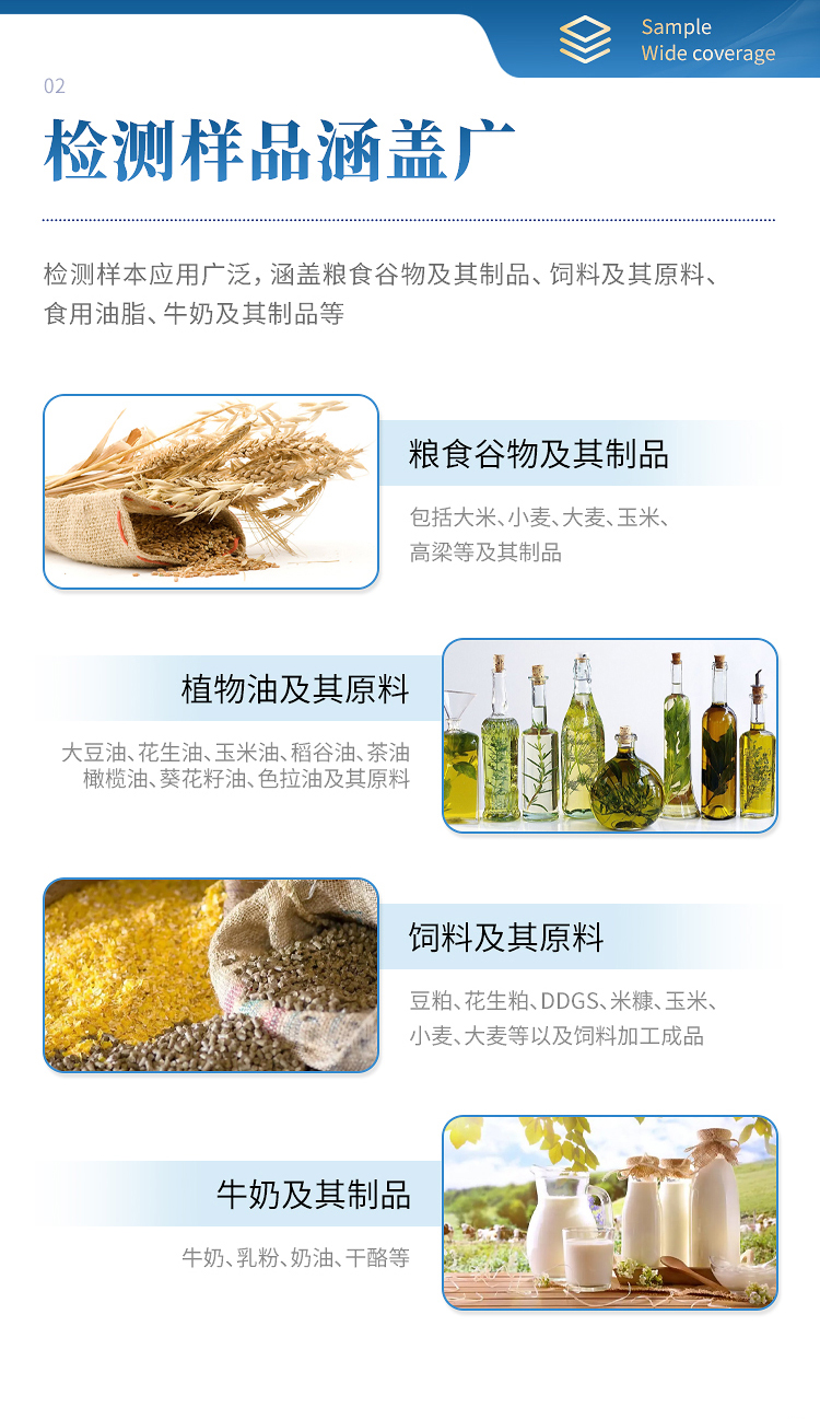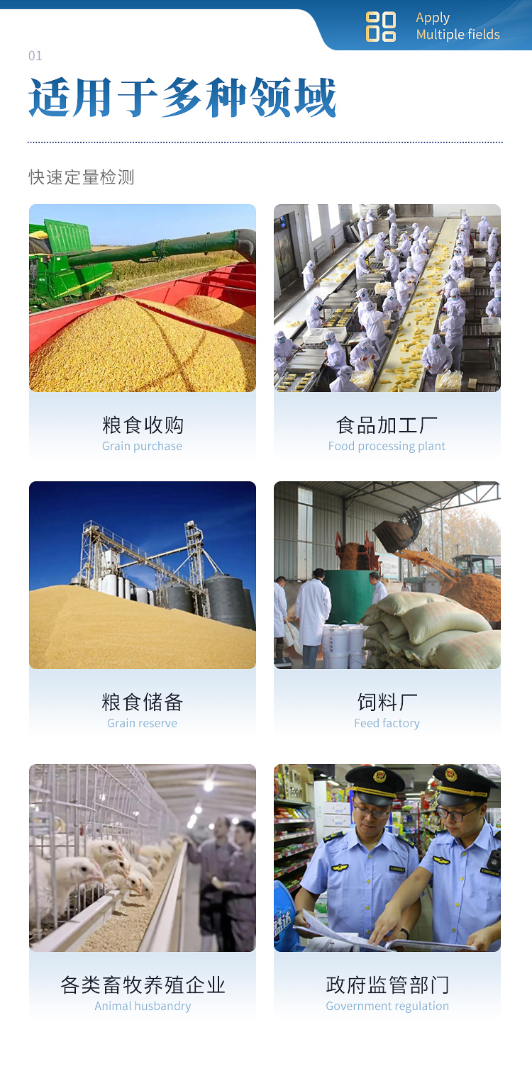 HM-L02型糧食真菌毒素檢測(cè)儀采用熒光定量快速檢測(cè)原理,主要檢測(cè)糧油谷物飼料中真菌毒素含量,包括黃曲霉毒素B1、黃曲霉毒素M1、玉米赤霉烯酮、嘔吐毒素、伏馬毒素等等,檢測(cè)樣品涵蓋糧食谷物(大米、玉米、小麥、大麥、高粱等)及其制品、飼料及其原料、食用油脂、牛奶及其制品等;樣品前處理簡(jiǎn)單,整個(gè)檢測(cè)過(guò)程檢測(cè)12min,產(chǎn)品適用于地方糧庫(kù)、谷物生產(chǎn)企業(yè)、飼料廠、各類(lèi)畜牧養(yǎng)殖企業(yè)、面粉廠、食品加工廠、第三方檢測(cè)機(jī)構(gòu)及各級(jí)政府監(jiān)管部門(mén)。