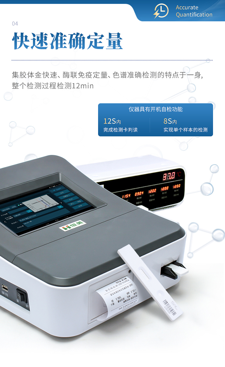 11、檢測(cè)判讀:儀器具有開(kāi)機(jī)自檢功能,12S內(nèi)完成檢測(cè)卡判讀,單個(gè)樣本的檢測(cè)時(shí)間小于8S。