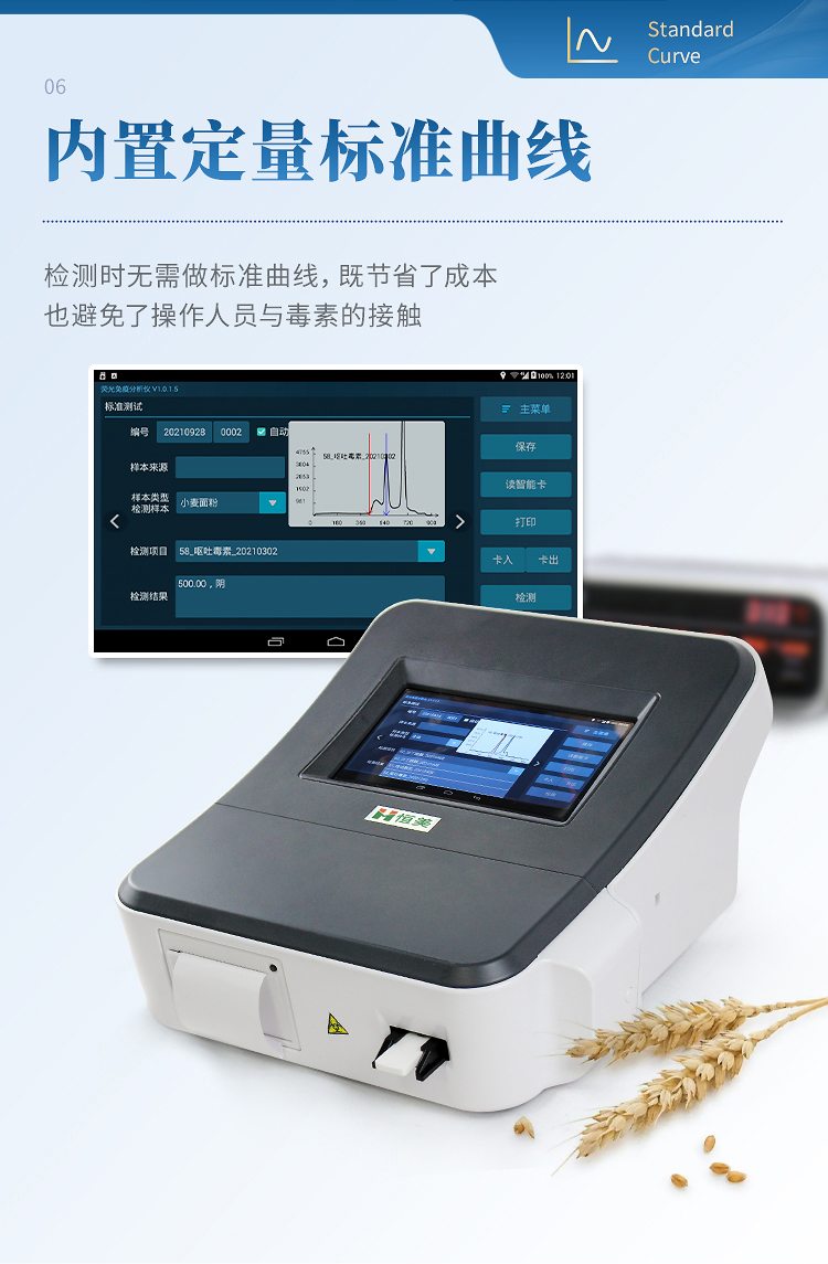 3、內(nèi)置定量標(biāo)準(zhǔn)曲線:儀器內(nèi)置標(biāo)準(zhǔn)曲線,無(wú)需使用標(biāo)準(zhǔn)品,檢測(cè)時(shí)無(wú)需做標(biāo)準(zhǔn)曲線,既節(jié)省了成本,也避免了操作人員與嘔吐毒素的接觸,保護(hù)操作人員的安全;