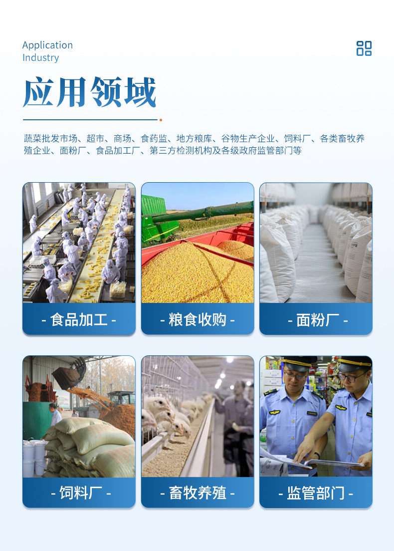 多通道糧食重金屬檢測(cè)儀采用熒光定量快速檢測(cè)原理,主要檢測(cè)糧油谷物飼料中真重金屬鉛和鎘,檢測(cè)樣品涵蓋糧食谷物(大米、玉米、小麥、大麥、高粱等)及其制品、飼料及其原料、食用油脂、牛奶及其制品等;樣品前處理簡單,整個(gè)檢測(cè)過程檢測(cè)12 min,產(chǎn)品適用于地方糧庫、谷物生產(chǎn)企業(yè)、飼料廠、各類畜牧養(yǎng)殖企業(yè)、面粉廠、食品加工廠、第三方檢測(cè)機(jī)構(gòu)及各級(jí)政府監(jiān)管部門;