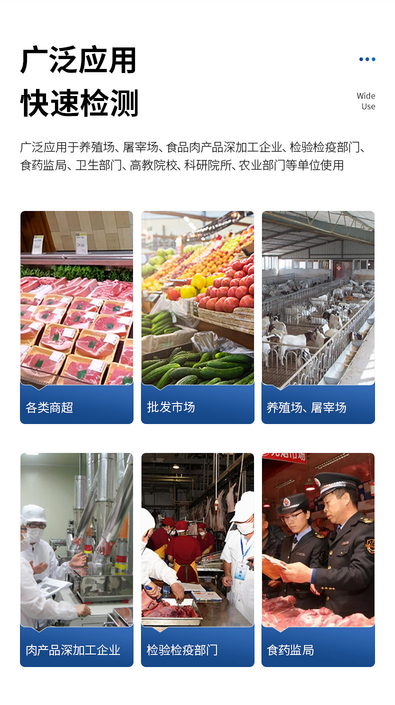 該肉制品檢測儀為集成化肉品安全快速檢測分析設(shè)備,廣泛應(yīng)用于養(yǎng)殖場、屠宰場、食品肉產(chǎn)品深加工企業(yè)、檢驗(yàn)檢疫部門、食藥監(jiān)局、衛(wèi)生部門、高教院校、科研院所、農(nóng)業(yè)部門等單位使用。