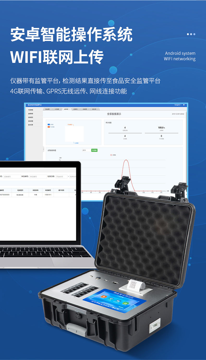 4、儀器帶有監(jiān)管平臺,數(shù)據(jù)可局域網(wǎng)和互聯(lián)網(wǎng)數(shù)據(jù)上傳,檢測結(jié)果直接傳至食品安全監(jiān)管平臺。進(jìn)行區(qū)域食品安全監(jiān)管及大數(shù)據(jù)分析處理與數(shù)據(jù)統(tǒng)計(jì),檢測區(qū)域食品安全長短期動(dòng)態(tài),達(dá)到食品安全問題預(yù)估、預(yù)警