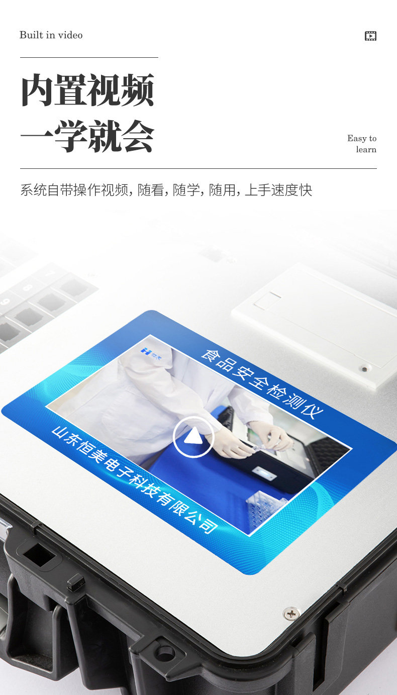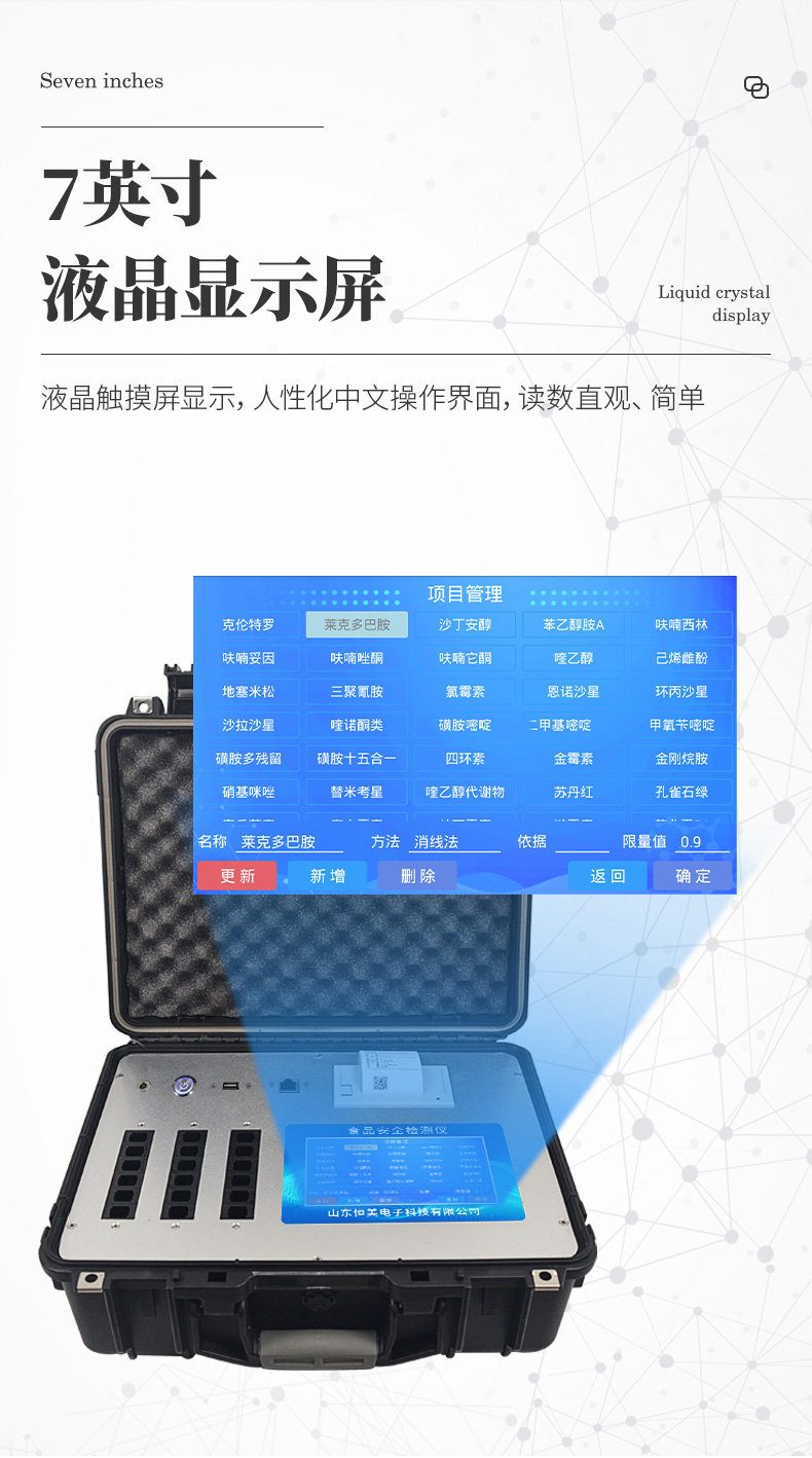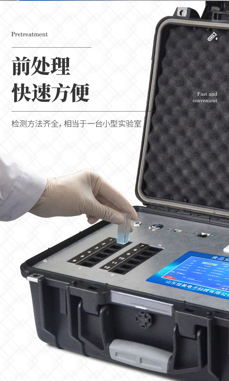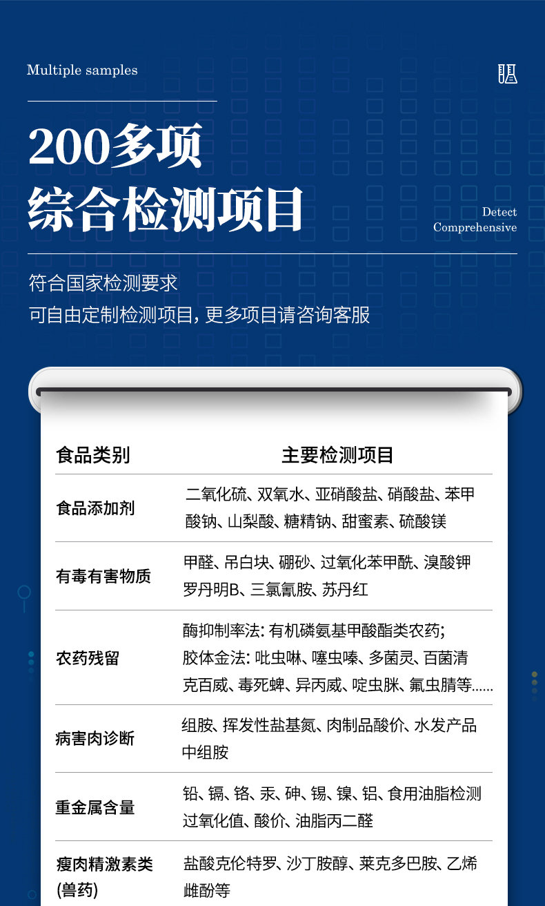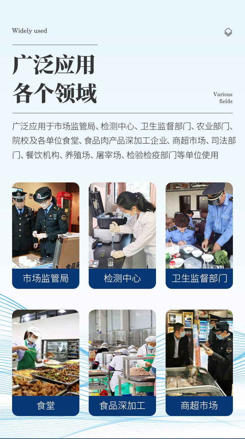 食品安全檢測(cè)設(shè)備可快速檢測(cè)200多項(xiàng)目,包含非食用化學(xué)物質(zhì)、濫用食品添加劑、農(nóng)藥殘留、獸藥殘留、重金屬、病害肉、營(yíng)養(yǎng)強(qiáng)化劑、抗生素類(lèi)殘留、激素類(lèi)殘留、真菌毒素類(lèi)殘留、化學(xué)類(lèi)殘留等現(xiàn)場(chǎng)的定性定量檢測(cè)。