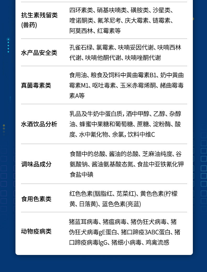 果蔬中:農(nóng)藥殘留,病害肉診斷:組胺、揮發(fā)性鹽基氮、肉制品酸價(jià)、水發(fā)產(chǎn)品中組胺