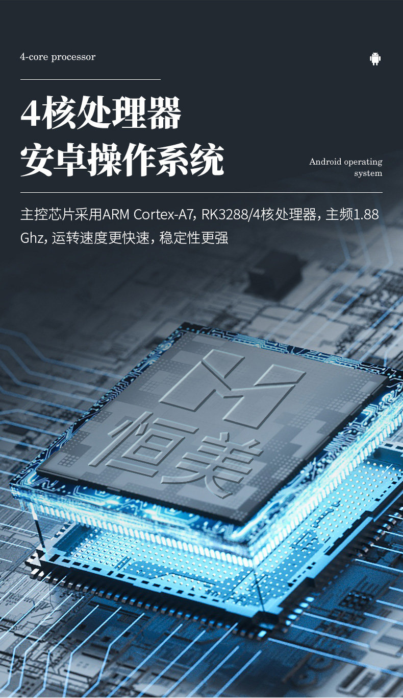 1、主控芯片采用ARM Cortex-A7,RK3288/4核處理器,主頻1.88Ghz,運(yùn)轉(zhuǎn)速度更快速,穩(wěn)定性更強(qiáng)。