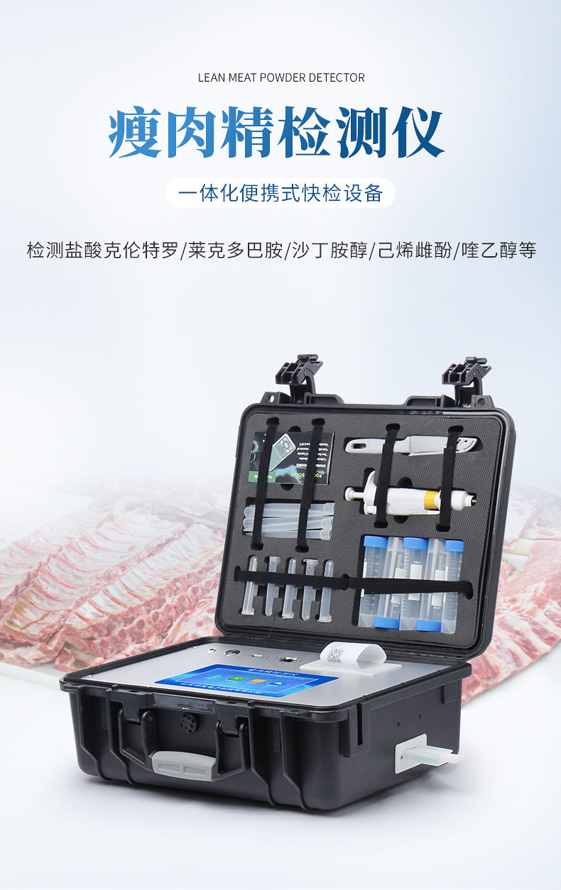 瘦肉精快速檢測儀可現(xiàn)場快速檢測鹽酸克倫特羅、萊克多巴胺、沙丁胺醇、己烯雌酚、喹乙醇等。儀器預(yù)留其他項目檢測程序和端口,根據(jù)日后需求可方便的自主增加檢測項目。日后可升級為檢測抗生素、獸藥殘留、動物疫病、病害肉、的綜合類型儀器。