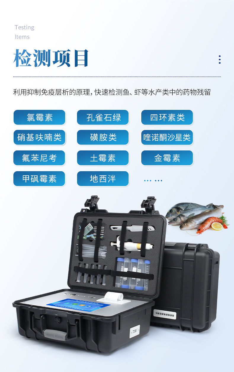 水產(chǎn)品藥物殘留檢測儀可快速檢測魚、蝦等水產(chǎn)類中的氯霉素、孔雀石綠、四環(huán)素類、硝基呋喃類、磺胺類、喹諾酮沙星類、氟苯尼考、土霉素、金霉素、甲砜霉素、地西泮等快速檢測,如氯霉素快速檢測卡整個檢測過程只需要30分鐘左右, 靈敏度為 0.3 μg/kg (ppb)。該快速檢測系統(tǒng)設備為集成化食品安全快速檢測分析設備,廣泛應用于農(nóng)貿(mào)市場、海鮮市場、食品肉產(chǎn)品深加工企業(yè)、食藥監(jiān)局、衛(wèi)生部門、水產(chǎn)養(yǎng)殖場、檢驗檢疫部門、農(nóng)業(yè)部門、第三方機構等單位使用。