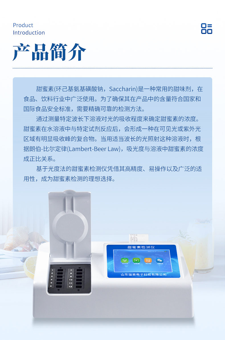 該檢測(cè)儀通過(guò)測(cè)量特定波長(zhǎng)下溶液對(duì)光的吸收程度來(lái)確定甜蜜素的濃度。甜蜜素在水溶液中與特定試劑反應(yīng)后,會(huì)形成一種在可見(jiàn)光或紫外光區(qū)域有明顯吸收峰的復(fù)合物。當(dāng)用適當(dāng)波長(zhǎng)的光照射這種溶液時(shí),根據(jù)朗伯-比爾定律(Lambert-Beer Law),吸光度與溶液中甜蜜素的濃度成正比關(guān)系。