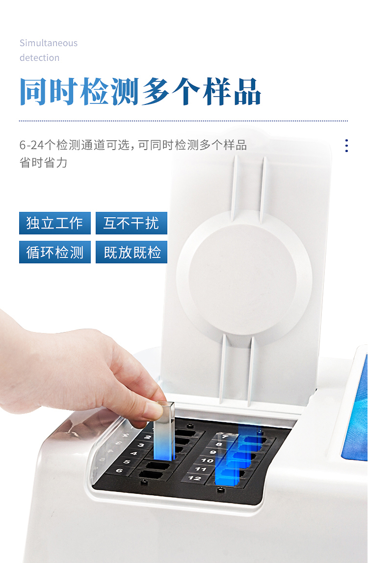 4、檢測通道:12個檢測通道,可以同時測試多個樣品,循環(huán)檢測,即放即檢,每個樣品由程序控制分別獨立工作,不會互相干擾。