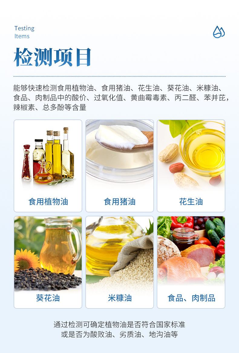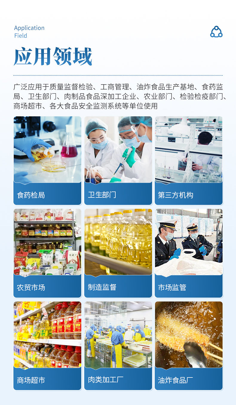 廣泛應(yīng)用于質(zhì)量監(jiān)督檢驗(yàn)、工商管理、油炸食品生產(chǎn)基地、食藥監(jiān)局、衛(wèi)生部門、肉制品食品深加工企業(yè)、農(nóng)業(yè)部門、檢驗(yàn)檢疫部門、商場超市、各大食品安全監(jiān)測系統(tǒng)等單位使用。