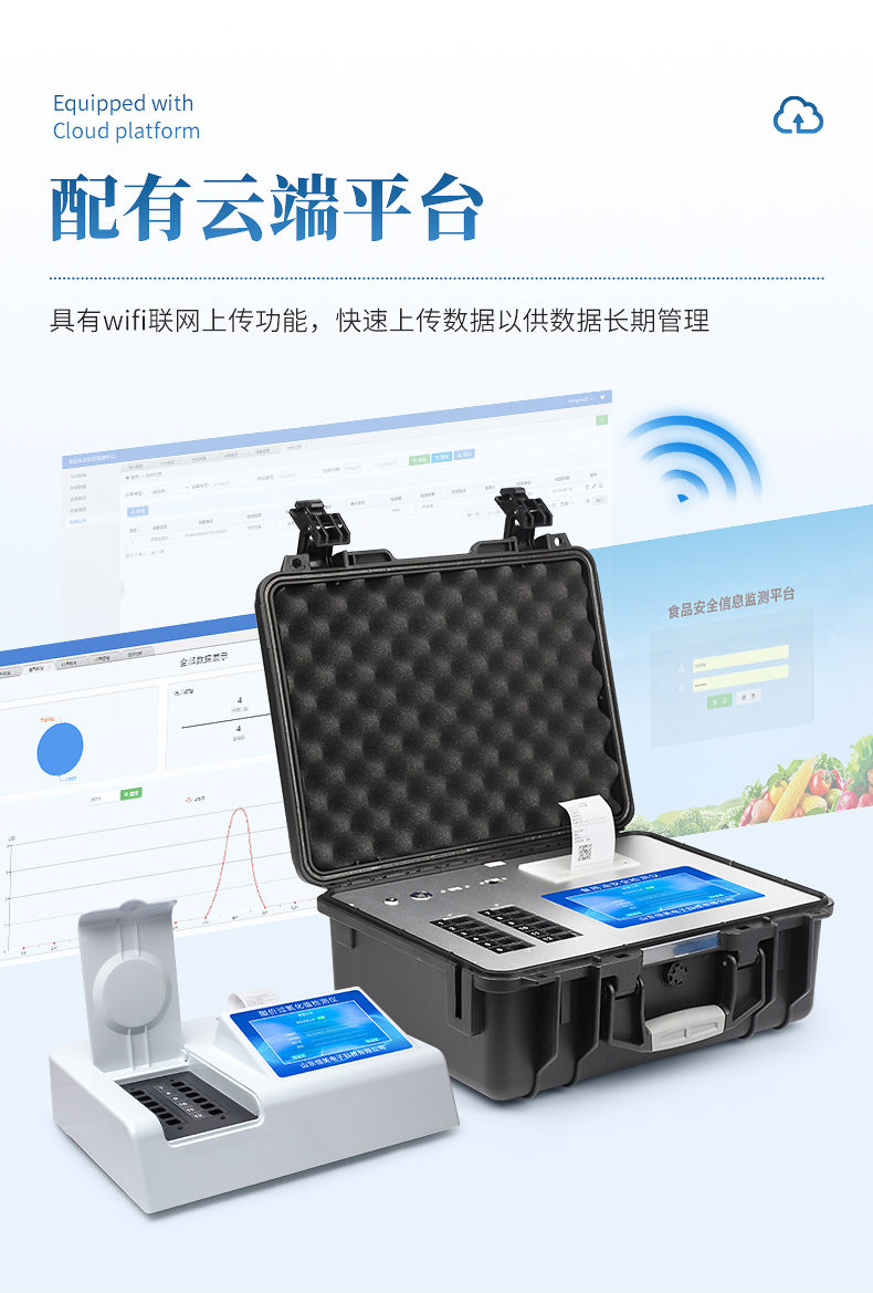 4、儀器帶有監(jiān)管平臺(tái),數(shù)據(jù)可局域網(wǎng)和互聯(lián)網(wǎng)數(shù)據(jù)上傳,檢測結(jié)果直接傳至食品安全監(jiān)管平臺(tái)。進(jìn)行區(qū)域食品安全監(jiān)管及大數(shù)據(jù)分析處理與數(shù)據(jù)統(tǒng)計(jì),檢測區(qū)域食品安全長短期動(dòng)態(tài),達(dá)到食品安全問題預(yù)估、預(yù)警