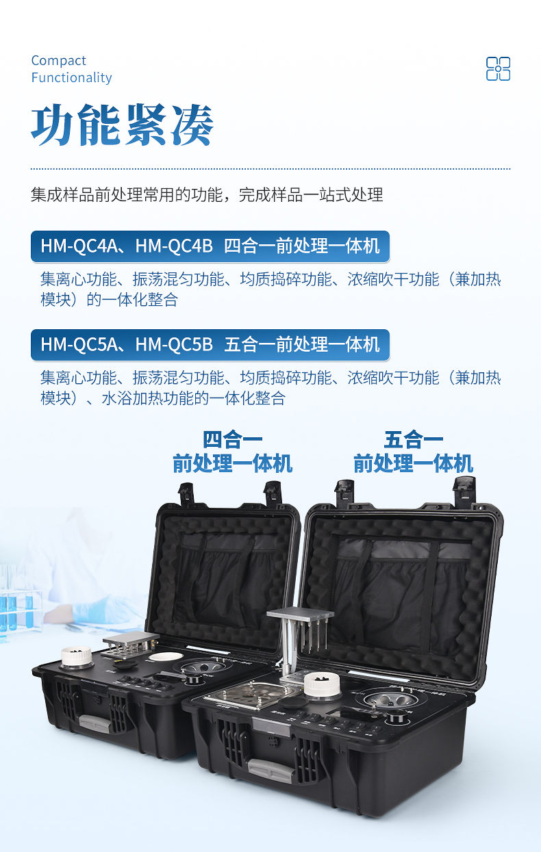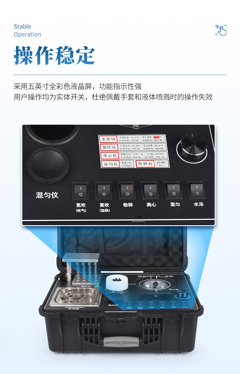 QC4型四合一樣品檢測前處理一體機(箱)是集吹干、離心、均質(zhì)、混勻功能的一體化整合,極大的簡化和集中樣品前處理的一般操作過程,結(jié)合移動便攜的工程塑料箱體,特別適合農(nóng)獸藥殘留畜禽水產(chǎn)品質(zhì)量安全現(xiàn)場快速檢測。