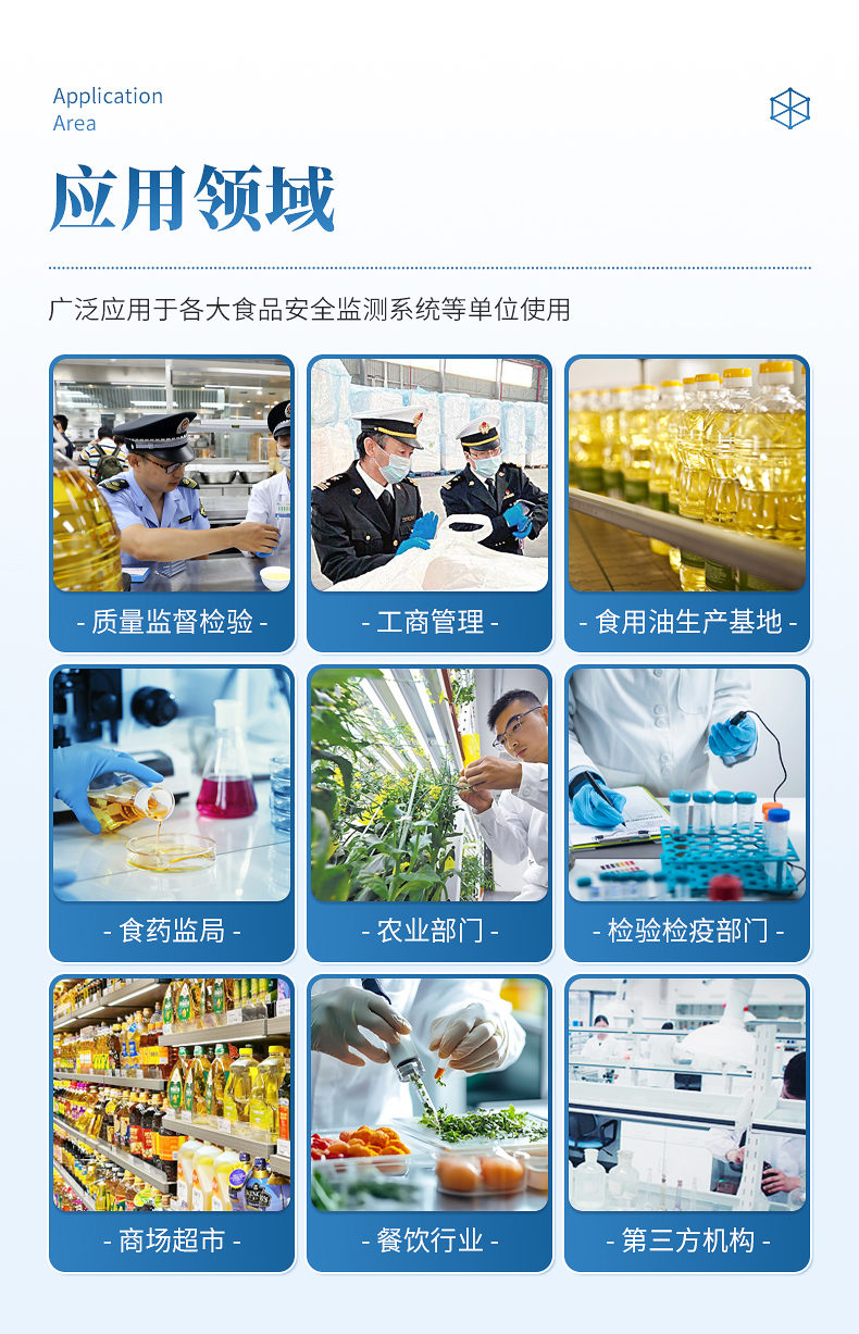 廣泛應(yīng)用于質(zhì)量監(jiān)督檢驗(yàn)、工商管理、食用油生產(chǎn)基地、食藥監(jiān)局、農(nóng)業(yè)部門、檢驗(yàn)檢疫部門、商場超市、各大食品安全監(jiān)測系統(tǒng)等單位使用。