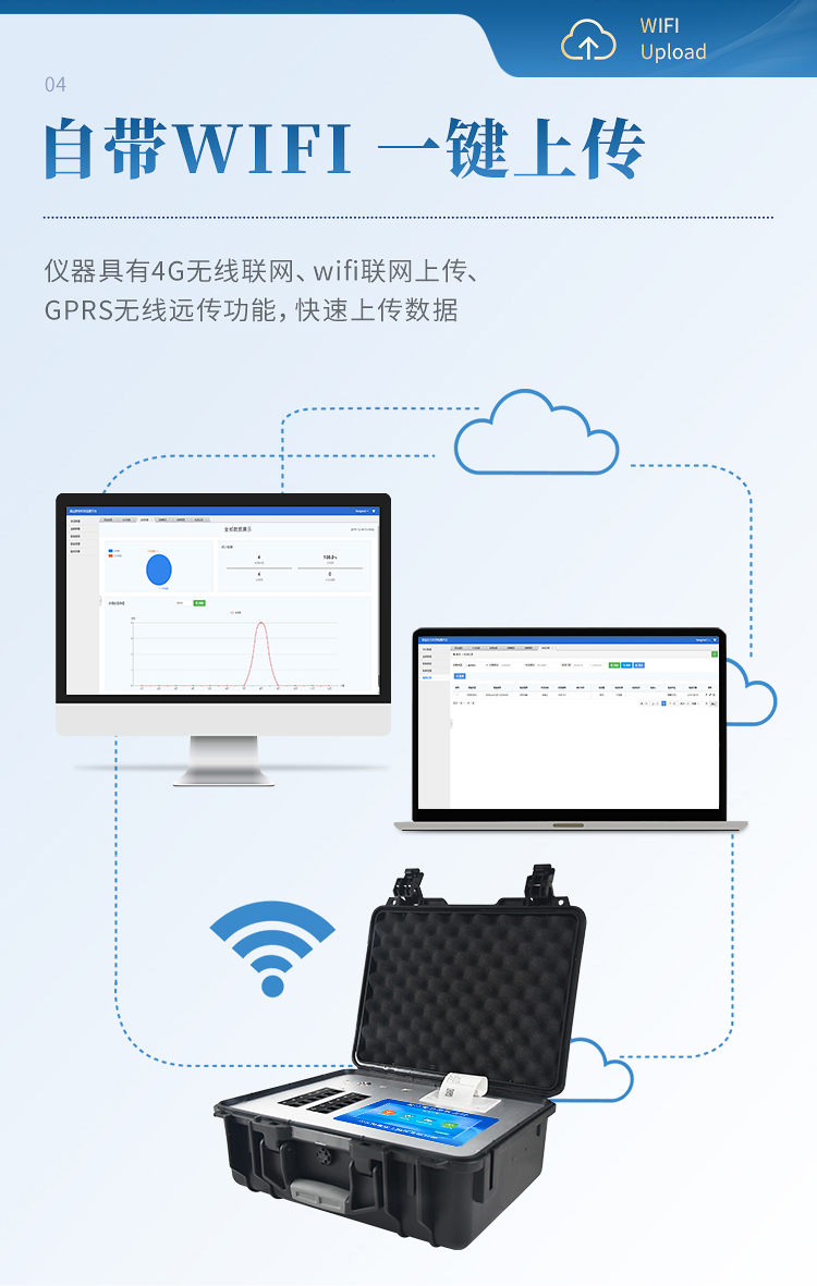 3、儀器具有4G無(wú)線聯(lián)網(wǎng)、wifi聯(lián)網(wǎng)上傳、GPRS無(wú)線遠(yuǎn)傳功能,快速上傳數(shù)據(jù)。
