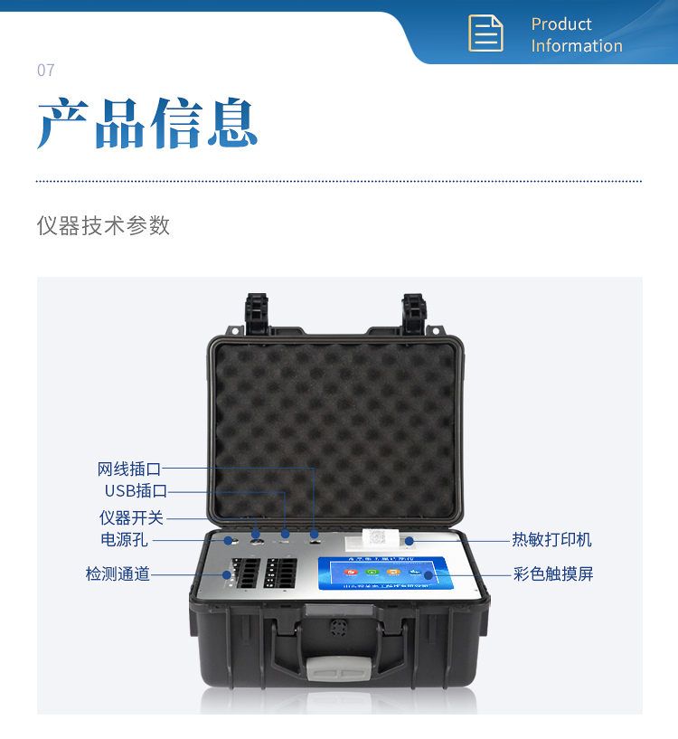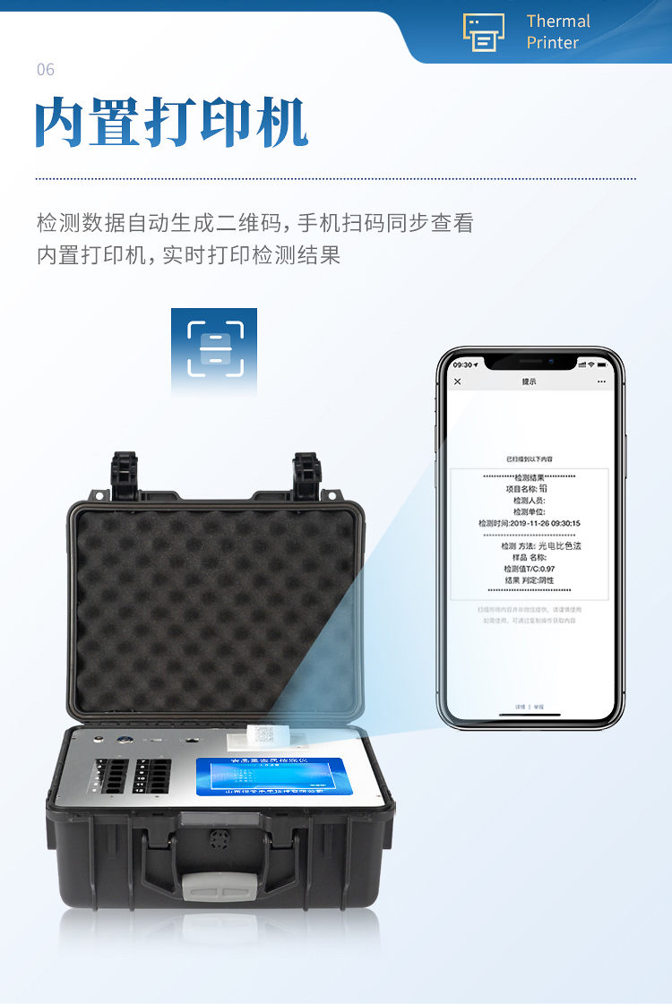 7、高速熱敏打印機(jī),實(shí)時(shí)打印檢測(cè)結(jié)果。內(nèi)置大容量電池,便于現(xiàn)場(chǎng)執(zhí)法檢測(cè)。